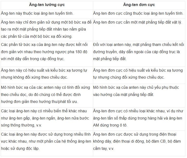 Sự khác biệt giữa ăng-ten lưỡng cực và ăng-ten đơn cực bao gồm những điểm sau.