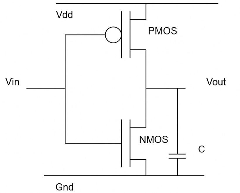 - Đầu vào được tạo thành từ các bóng bán dẫn NMOS và PMOS có điện áp đầu vào được áp vào cổng của chúng cùng với đầu ra được kết nối với cực thoát của hai bóng bán dẫn này.