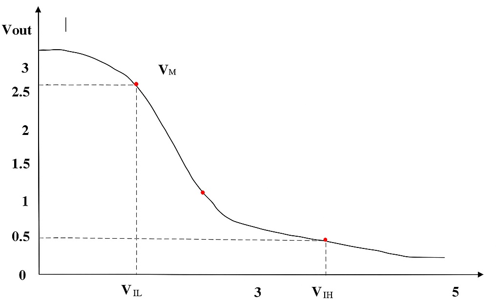 - VTC giống như một hàm bước đảo ngược do độ chính xác tăng lên khi chuyển đổi BẬT/TẮT. Chất lượng trong vùng chuyển đổi được thể hiện qua sự tồn tại của các độ dốc được xác định rõ ràng, cho phép chuyển đổi chính xác. Bằng cách so sánh giá trị đầu vào thấp nhất trong mỗi vùng hoạt động BẬT hoặc TẮT với giá trị đầu ra cao nhất, người ta có thể tính toán dung sai nhiễu.