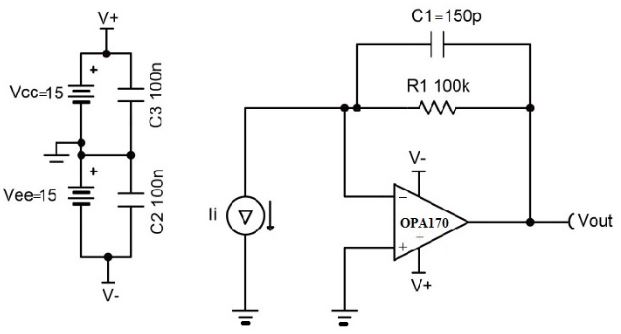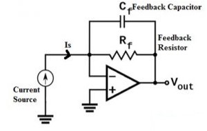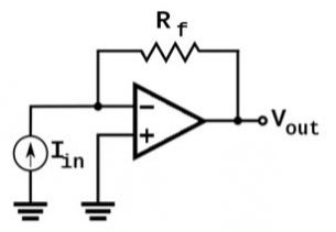 Khi một dòng điện, chẳng hạn như 'Is', chạy vào chân đảo ngược của bộ khuếch đại chuyển trở kháng. Điện áp đầu ra của bộ khuếch đại này có thể được xác định bằng điện trở và giá trị dòng điện đầu vào.