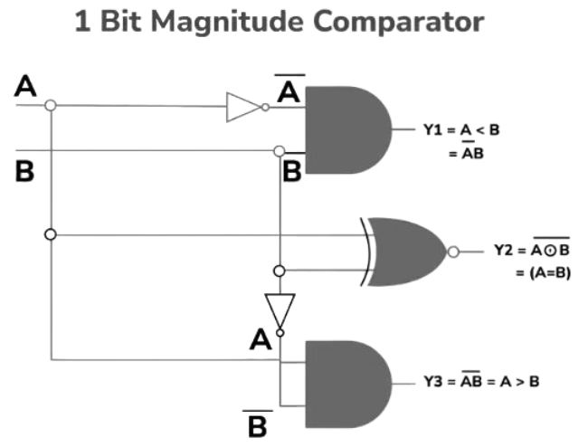 Một bộ so sánh được sử dụng để so sánh hai bit được gọi là bộ so sánh một bit. Nó bao gồm hai đầu vào mỗi đầu vào cho hai số bit đơn và ba đầu ra để tạo ra nhỏ hơn, bằng và lớn hơn giữa hai số nhị phân.