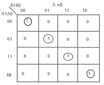 A>B:A1B1' + A0B1'B0' + A1A0B0'A=B: A1'A0'B1'B0' + A1'A0B1'B0 + A1A0B1B0 + A1A0'B1B0' : A1'B1' (A0'B0' + A0B0) + A1B1 (A0B0 + A0'B0') : (A0B0 + A0'B0') (A1B1 + A1'B1') : (A0 Ex-Nor B0) (A1 Ex-Nor B1)A<B:A1'B1 + A0'B1B0 + A1'A0'B0