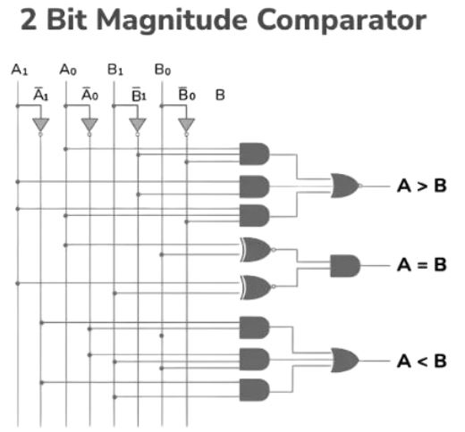 Một bộ so sánh được sử dụng để so sánh hai số nhị phân, mỗi số của hai bit được gọi là bộ so sánh độ lớn 2 bit. Nó bao gồm bốn đầu vào và ba đầu ra để tạo ra nhỏ hơn, bằng và lớn hơn giữa hai số nhị phân.