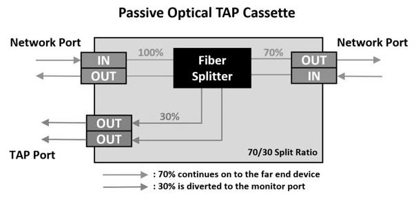 Một thành phần quan trọng khác trong việc triển khai mạng quang thụ động (PON) (ví dụ: GPON, FTTX, v.v.) là bộ chia tín hiệu, đôi khi được gọi là bộ chia chùm tia. Bộ chia chùm tia hoạt động bằng cách chia tín hiệu quang từ một sợi quang đơn thành nhiều chùm tia để phân phối dịch vụ trên nhiều cáp. Nó cũng thường được sử dụng để giám sát hoặc kiểm tra việc truyền tín hiệu quang trực tiếp mà không cần xâm nhập. Trên thực tế, các giải pháp Điểm Phân tích Lưu lượng Thụ động (TAP) như hộp TAP HD8² sử dụng công nghệ chia tín hiệu tích hợp để chia luồng dữ liệu thành hai đường dẫn: một đường dẫn truyền dữ liệu đến địa chỉ gốc và đường dẫn còn lại gửi dữ liệu đã sao chép đến cổng giám sát lưu lượng.