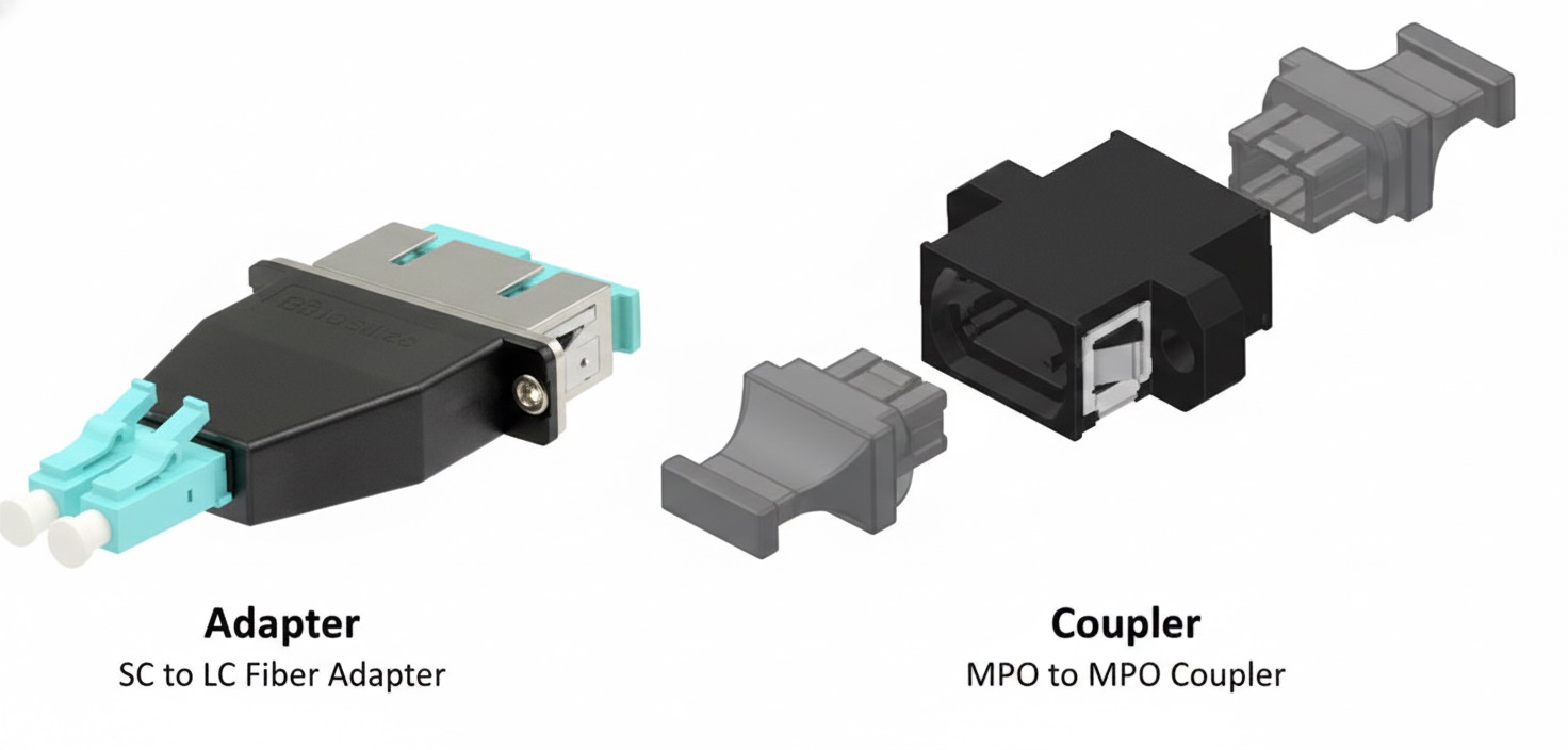Bộ chuyển đổi và đầu nối cáp quang được thiết kế để ghép hai cáp quang đã được đấu nối đầu cuối lại với nhau theo cách căn chỉnh chính xác các đầu sợi quang để giảm thiểu tổn hao. Các thuật ngữ này thường được sử dụng thay thế cho nhau, nhưng cũng giống như trong ngành ống nước, về mặt kỹ thuật, bộ chuyển đổi được sử dụng để kết hợp hai thành phần khác nhau, trong khi đầu nối được sử dụng để kết hợp hai thành phần giống hệt nhau. Ví dụ, một bộ chuyển đổi cáp quang có thể được sử dụng để kết nối một cáp có đầu nối sợi quang ST với một cáp có đầu nối sợi quang LC. Ngược lại, một đầu nối cáp quang kết nối hai sợi quang có đầu nối cùng loại, cho dù là LC hay MTP/MPO.