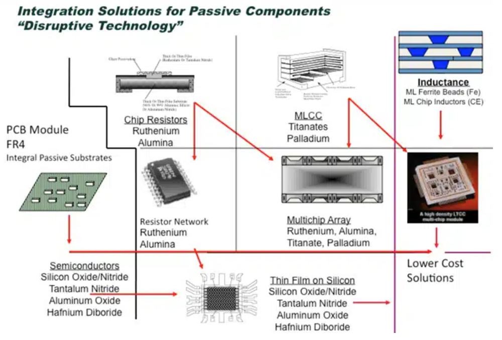 Một số nền tảng công nghệ linh kiện điện tử thụ động có khả năng tương tác (xem Hình 4), và một số vật liệu nhất định rất phù hợp cho các quy trình này. Với 50 năm dữ liệu ứng dụng kỹ thuật và thực tế có sẵn, một khách hàng thương hiệu nổi tiếng đã chỉ ra rằng họ cần bắt đầu mở rộng tầm nhìn và tìm hiểu thêm về nhiều loại vật liệu hơn để mở rộng vùng an toàn của mình vượt ra ngoài giới hạn của bảng tuần hoàn. Các kỹ sư thiết kế trong tương lai sẽ cần hiểu sâu hơn về vật liệu và các quy trình để tạo ra các linh kiện "gần như vô hình, hoạt động hoàn hảo ngay từ lô hàng đầu tiên và tích hợp liền mạch với các linh kiện khác". Do đó, biểu đồ sau đây (Hình 4) minh họa bảy cách để tối ưu hóa hiệu suất thể tích trong sản xuất các linh kiện riêng lẻ, phần lớn được thúc đẩy bởi nhu cầu về mô-đun, chipset và chiplet.