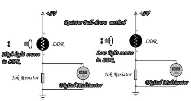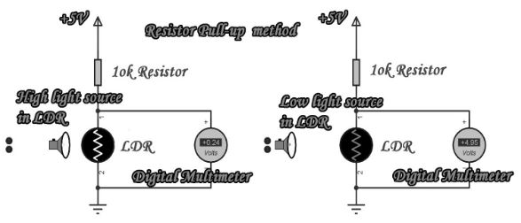 - Đầu tiên kết nối tất cả kết nối như hình trên. Mạch này là phương pháp kéo lên điện trở. Bây giờ, bạn sẽ cung cấp nguồn điện. Khi nguồn sáng tăng, điện áp sẽ giảm và nguồn sáng giảm, điện áp sẽ tăng. nếu tình trạng có thể xảy ra, LDR là tình trạng tốt hoặc LDR là hư hỏng.