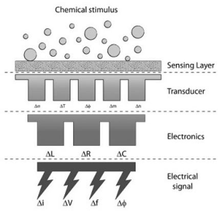 Cấu trúc của cảm biến hóa học được hiển thị bên dưới. Cảm biến này được tạo thành từ hai thành phần chính: vật liệu thu hoặc vật liệu cảm biến và đầu dò. Vật liệu cảm biến phản ứng với chất phân tích mục tiêu theo những cách khác nhau tùy thuộc vào loại cảm biến. Kết quả của phản ứng này là sự thay đổi tính chất của vật liệu, chẳng hạn như tình trạng dẫn điện và khối lượng của nó.