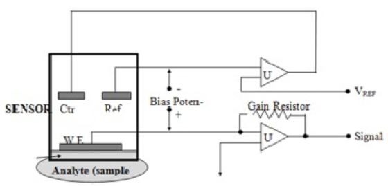 Điện cực này chỉ hoạt động như một nửa tế bào thứ hai và để lại các electron vào hoặc ra khỏi chất điện phân. Mạch bên dưới điều khiển điện thế của điện cực làm việc và chuyển đổi dòng tín hiệu thành điện áp được gọi là chiết áp. Dòng điện từ điện cực làm việc (WE) được chuyển đổi thành điện áp thông qua opamp U2, vì vậy mạch này duy trì điện áp của điện cực làm việc ở phân cực tiềm năng (Vbias).