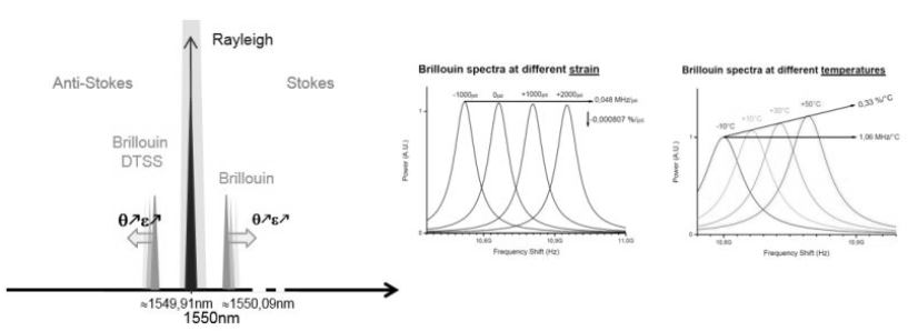 - Bước sóng của ánh sáng brilluin tán xạ ngược khác với bước sóng của ánh sáng tới phía trước và được gọi là "stokes" và "antistokes". Sự khác biệt về mức độ và tần số của brilliinstokes và antistogues là một bức tranh về nhiệt độ và ứng suất dọc theo các sợi.
