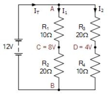 Bây giờ khi VR4 có điện áp giảm 4 vôn, chênh lệch điện áp giữa các điểm C và D sẽ là 4 vôn, vì C = 8 vôn và D = 4 vôn, vì vậy lần này chênh lệch điện áp là 8 – 4 = 4 vôn.