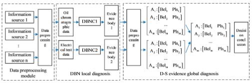 Dựa trên khuôn khổ khái niệm chung về tích hợp dữ liệu và đặc điểm sự cố máy biến áp, DBN được kết hợp với tích hợp dữ liệu và được áp dụng để chẩn đoán sự cố trong bài báo này. Chẩn đoán DBN là một quá trình nhập đặc tính và xuất ra quyết định. Về mặt tích hợp dữ liệu, lý thuyết bằng chứng DS tích hợp và lý giải với nhiều bằng chứng khác nhau trong cùng một khuôn khổ, dẫn đến một quyết định thống nhất. Sự tích hợp này có thể cải thiện đáng kể độ tin cậy và độ chính xác của chẩn đoán. Do đó, bài báo này thiết lập một mô hình chẩn đoán tích hợp dữ liệu phân cấp cho các sự cố máy biến áp đa điểm dựa trên sự tích hợp của DBN và lý thuyết bằng chứng DS, như thể hiện trong Hình 3. Các tham số DGA bao gồm H2, CH4, C2H6, v.v. Dữ liệu thử nghiệm điện bao gồm hệ số mất cân bằng cuộn dây, tổn thất điện môi cuộn dây và dòng điện nối đất lõi.
