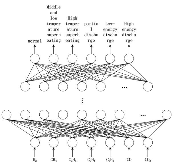 Bài báo này sử dụng mô hình mạng lưới niềm tin sâu (DBNC) (như thể hiện trong Hình 4, cụ thể là mô hình DBNC khí DGA). Đầu vào của mô hình là bảy giá trị hàm lượng khí đặc trưng (sau khi chuẩn hóa) của sắc ký đồ dầu trực tuyến. Cuối cùng, đầu ra của bộ phân loại Softmax ở trên là xác suất các mẫu tương ứng ở các trạng thái khác nhau. Trạng thái có xác suất cao nhất là kết quả phân loại. Cuối cùng, lý thuyết bằng chứng DS được sử dụng.