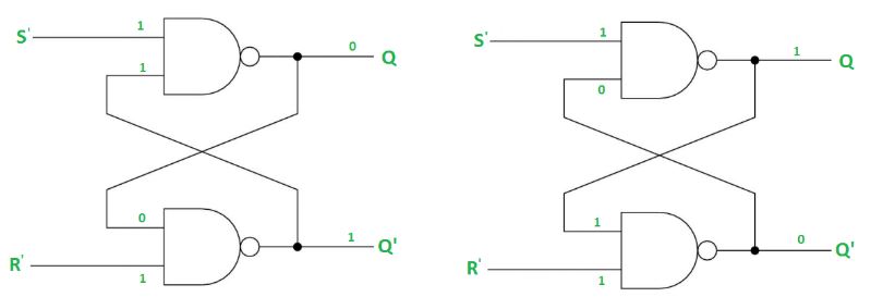 - Ở cổng NAND thứ hai, vì đầu vào Q và R' là 1, Q'=0.