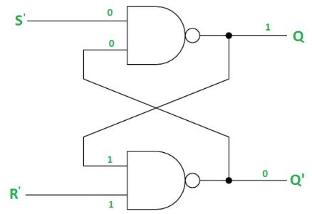 - Nếu Q = 1, đầu vào Q và R' cho cổng NAND thứ 2 đều là 1.