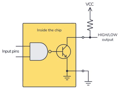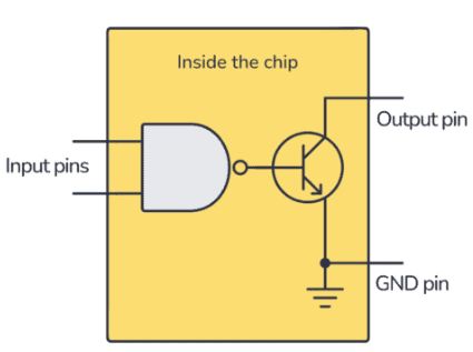 Ngõ ra collector hở không phải là ngõ ra cao/thấp thông thường. Thay vào đó, các ngõ ra này được kết nối thông qua một transistor . Cực collector của transistor nằm ở chân này. Ví dụ, nếu bạn có một cổng NAND với ngõ ra collector hở, nó sẽ trông như thế này: