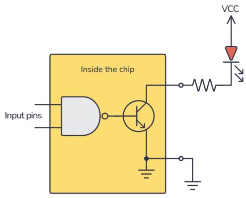 Lưu ý: Một số chip sử dụng transistor MOSFET thay vì BJT. Trong trường hợp đó, kỹ thuật này được gọi là open-drain, nhưng khái niệm thì hoàn toàn giống nhau.