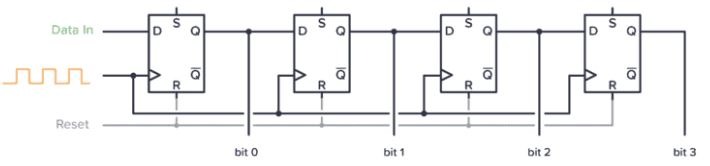 Để tạo một thanh ghi dịch chuyển , hãy kết nối đầu ra của một flip-flop với đầu vào của flip-flop tiếp theo. Các bit mới sẽ đi vào flip-flop đầu tiên bên trái. Và với mỗi xung nhịp, các bit được lưu trữ trong các flip-flop khác sẽ được dịch chuyển một vị trí sang phải.