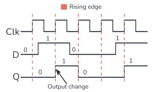 Sơ đồ thời gian của mạch này được hiển thị bên dưới. Nó cho thấy cách hoạt động của một Flip-Flop D được kích hoạt bằng cạnh lên. Ngõ ra Q chỉ thay đổi theo giá trị ngõ vào D tại thời điểm xung nhịp tăng từ 0 lên 1.