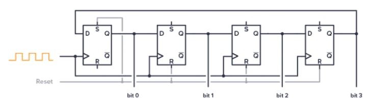 Nếu bạn lấy đầu ra từ flip-flop cuối cùng trong thanh ghi dịch chuyển và kết nối nó với đầu vào của flip-flop đầu tiên, bạn sẽ có được Bộ đếm Vòng . Đặt trước một trong các flip-flop bắt đầu bằng 1, sau đó giá trị 1 này sẽ được dịch chuyển liên tục trong Bộ đếm Vòng.