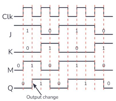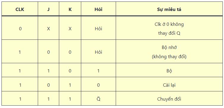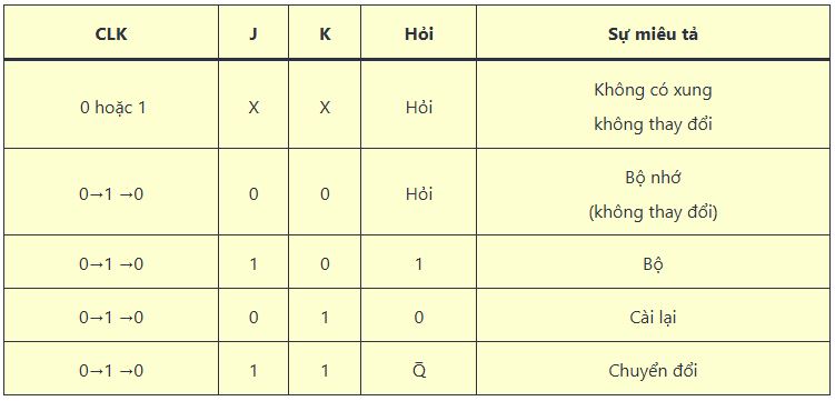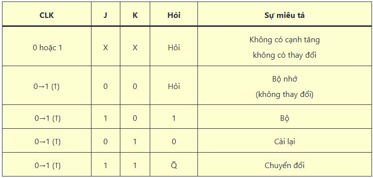 Đầu vào J và K của flip-flop JK có thể được sử dụng để thiết lập, khởi động lại hoặc chuyển đổi đầu ra, như sau: