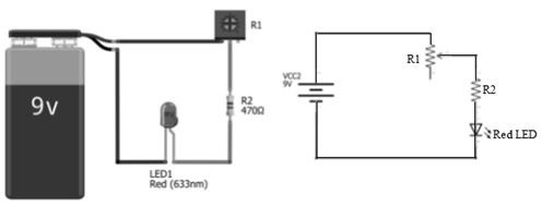 Các linh kiện điện tử thiết yếu cho mạch này bao gồm một pin, một điện trở biến đổi, một điện trở dự phòng và một đèn LED. Mạch có thể được kết nối như sau bằng cách sử dụng các linh kiện này.