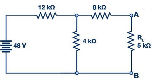 Vì không có dòng điện chạy qua điện trở 8 kΩ, nên không có sụt áp trên điện trở, do đó điện áp trên cực AB bằng điện áp trên điện trở 4 kΩ. Do đó, xuất hiện 12 V trên cực AB, nên điện áp Thevenin V TH = 12 V.