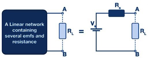 Hình vẽ cho thấy mạch tương đương Thevenin. Trong hình, ta có thể thấy nhiều phần tử điện trở được thay thế bằng một điện trở tương đương Rs và nhiều nguồn điện được thay thế bằng các nguồn điện áp tương đương Vs.