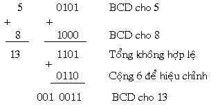 Tổng của phép cộng ở trên là 1101 không tồn tại trong mã BCD. Điều này xảy ra do tổng của hai ký số vượt quá 9. Trong trường hợp này ta phải hiệu chỉnh bằng cách cộng thêm 6 (0110) vào nhằm tính đến việc bỏ qua 6 nhóm mã không hợp lệ.