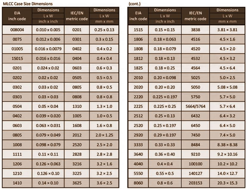 Tiêu chuẩn kỹ thuật MLCC được điều chỉnh bởi EIA-198. Kích thước và hình dạng tiêu chuẩn được đề xuất phản ánh tiêu chuẩn EIA của Hoa Kỳ, thường sử dụng đơn vị đo lường Anh (ví dụ: inch) thay vì đơn vị mét. Khi đọc biểu đồ tiêu chuẩn kỹ thuật, chẳng hạn như Hình 1, mã kích thước EIA tương ứng với kích thước của chính MLCC. Ví dụ: một chip hình chữ nhật có kích thước 0,08 in (chiều dài) x 0,05 in (chiều rộng) sẽ được mã hóa là "0805". Khi xem biểu đồ, bạn cũng sẽ thấy mã của Ủy ban Kỹ thuật Điện Quốc tế/Ủy ban Tiêu chuẩn hóa Châu Âu (IEC/EN). Hội đồng Kỹ thuật Thiết bị Điện tử Liên hợp (JEDEC) đã tạo ra bộ tiêu chuẩn kỹ thuật này để phản ánh hệ mét. Xem Hình 1 bên dưới để biết kích thước và mã hệ mét EIA (inch) và IEC/EN.