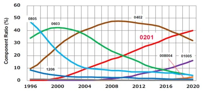 Theo thời gian, kích thước vỏ máy ngày càng nhỏ hơn. Các nhà thiết kế được giao nhiệm vụ giảm thiểu SWaP về kích thước, trọng lượng và công suất trong khi vẫn duy trì hoặc bổ sung chức năng. Không có gì ngạc nhiên khi các mã từ 0201 đến 1206 là những kích thước được yêu cầu nhiều nhất trong hai thập kỷ qua, theo Paumanok Research. Theo thời gian, phạm vi đó có xu hướng giảm dần. Điều đáng chú ý là ngành công nghiệp đã chứng kiến sự gia tăng dần dần sản lượng MLCC kích thước vỏ máy 1206 và 1210. Hình 3, do Murata cung cấp, cho thấy sự phát triển của tỷ lệ kích thước vỏ máy MLCC theo thời gian.