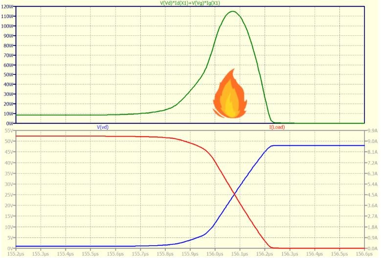 Hình 2 thể hiện đồ thị dao động của điểm tới hạn của mạch. Đồ thị bên dưới cho thấy đường cong màu xanh lam biểu thị điện áp cực máng và đường cong màu đỏ biểu thị dòng điện cực máng. Quá trình chuyển mạch không diễn ra tức thời, do đó có một lượng tổn thất công suất đáng kể gần điểm giao nhau của hai tín hiệu. Mức tiêu thụ điện năng được thể hiện bằng đồ thị phía trên (màu xanh lá cây), biểu thị công suất bị mất bởi MOSFET. Điểm này biểu thị tổn thất công suất do quá trình chuyển mạch. Về mặt lý thuyết, tần số chuyển mạch có thể được giảm xuống, nhưng độ méo hài sẽ tăng lên quá nhiều.