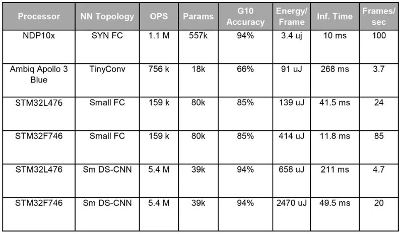 Trong số các MCU được thử nghiệm, chỉ có STM32F746 từ dòng sản phẩm hiệu suất cao F7xx của ST có thể vượt quá 20 khung hình / giây và làm như vậy với chi phí điện năng cao hơn khoảng 700 lần so với NDP, dẫn đến chi phí điện năng khoảng 50 mW (miliwatt). Ngoài sức mạnh cơ bản cần thiết để cung cấp năng lượng cho MCU trong giai đoạn đầu.
