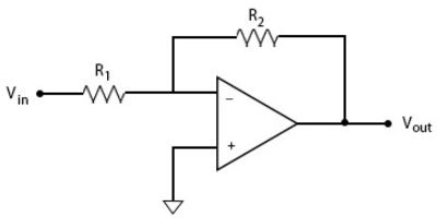 Vì đầu vào đảo ở mức nối đất ảo, nên đầu ra của op-amp đảo là Vout=-IR2=-VinR2/R1.