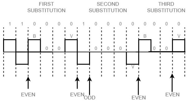 - Nếu số lượng xung không sau lần thay thế cuối cùng là lẻ, mô hình thay thế sẽ là "000V", điều này giúp duy trì tổng số xung không bằng không.