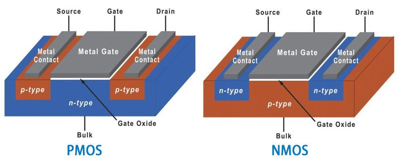 Cấu trúc của bóng bán dẫn NMOS và PMOS tương tự nhau ở nhiều điểm, nhưng có một điểm khác biệt quan trọng ở loại vật liệu bán dẫn được sử dụng.