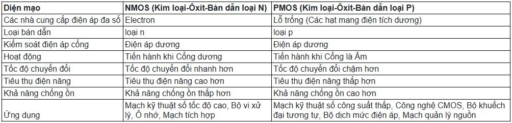 Bài viết này so sánh sự khác biệt về cấu trúc và hoạt động giữa bóng bán dẫn NMOS và PMOS.