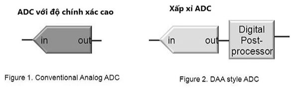 Hình 1 minh họa một bộ chuyển đổi ADC điển hình, và Hình 2 minh họa một bộ chuyển đổi ADC kiểu DAA. Trong Hình 2, một bộ chuyển đổi ADC thông thường hiệu suất cao, tiêu thụ điện năng thấp được thay thế bằng một bộ chuyển đổi ADC đơn giản hơn, tiêu thụ điện năng thấp hơn, sau đó được xử lý hậu kỳ bằng kỹ thuật số để áp dụng các hiệu chỉnh cho đầu ra nhằm đạt được độ chính xác tương đương với bộ chuyển đổi ADC thông thường. So với các bộ chuyển đổi ADC thông thường, các bộ chuyển đổi ADC kiểu DAA mang lại những lợi thế đáng kể về điện năng và không gian.