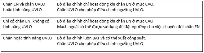 Bảng dưới đây minh họa các tình huống khác nhau liên quan đến chân EN và chân UVLO hoặc tính năng UVLO tích hợp.