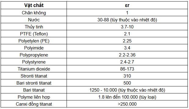Mỗi vật liệu có một giá trị tương đối khác nhau của phụ cấp tương đối. Ở đây, Chúng tôi đã liệt kê các vật liệu được sử dụng phổ biến nhất trong tụ điện, với giá trị er ở tần số 1kHz ở nhiệt độ phòng. Điều này có thể được sử dụng như một tài liệu tham khảo nhanh và hiển thị một loạt các giá trị được tìm thấy trong thực tế: